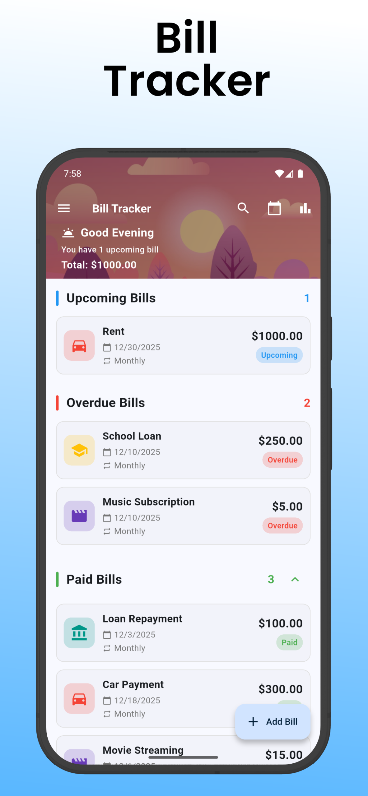 Never miss a bill payment again! Bill Tracker is the simple, powerful, and private app that helps you organize, track, and manage all your recurring bills and subscriptions in one place.